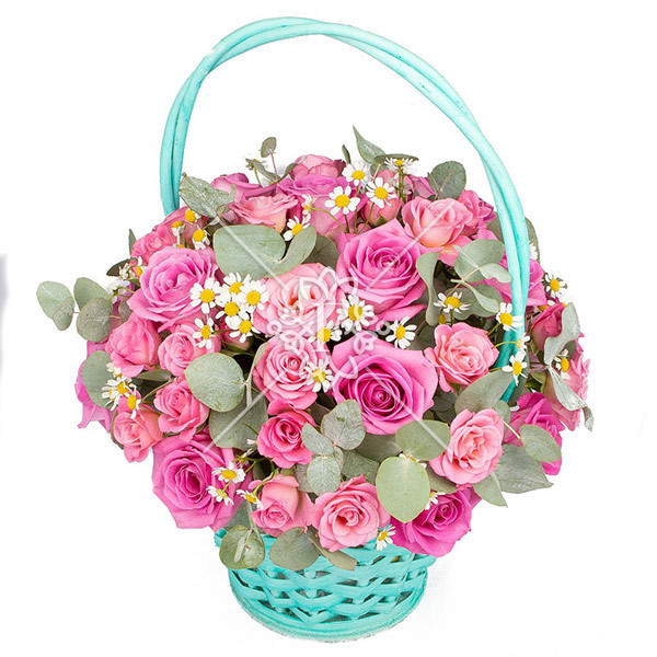 роза розовая – 11 шт., роза розовая кустовая – 6 шт., зелень декоративная (эвкалипт, ромашка, возможна замена на хамелациум),  оазис, корзинка.