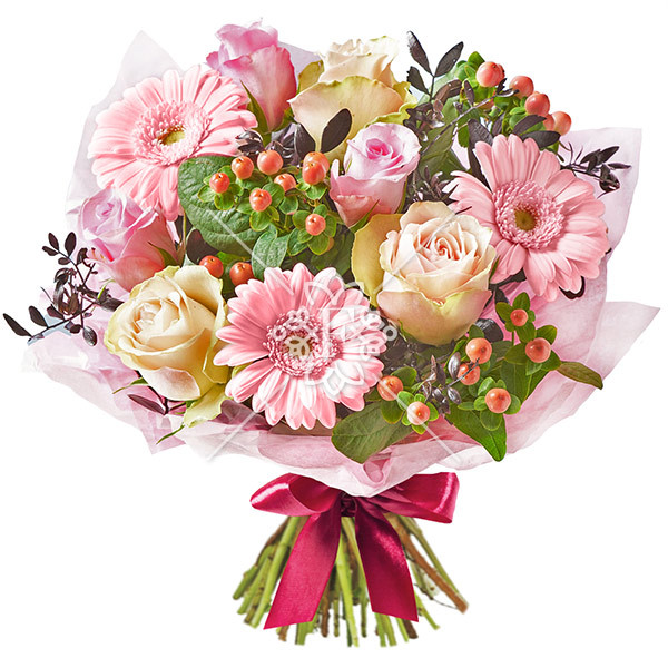 Классические розы представлены здесь в кремовом и розовом оттенке и гармонично сочетаются с розовыми герберами, а дополняет флористический ансамбль декоративная зелень и чудесный гиперикум.